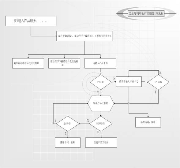 IVR系統(tǒng)是呼叫中心系統(tǒng)中極為重要的一環(huán)。作為面向用戶的窗口,IVR的語音交互方式引導(dǎo)用戶進(jìn)入不同的業(yè)務(wù)流程,聽取相關(guān)信息。清晰,流暢,禮貌而又有層次的IVR語音會(huì)給用戶留下深刻的印象。美承的IVR系統(tǒng)在設(shè)計(jì)上參照了其他成功的客服中心的經(jīng)驗(yàn),充分考慮了用戶的習(xí)慣,在流程上具有鮮明的特點(diǎn),以下以產(chǎn)品服務(wù)為例: