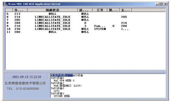 NBX呼叫中心的核心設(shè)備是3Com公司的NBX網(wǎng)絡(luò)交換機(jī),NBX網(wǎng)絡(luò)交換機(jī)支持開放式電話開發(fā)平臺TAPI2.X,TAPI它是Microsoft電話技術(shù)應(yīng)用程序編程界面標(biāo)準(zhǔn),運用TAPI可以方便、高效地完成針對語音線路的控制開發(fā),從而完成自動語音應(yīng)答(IVR)、自動話路分配(ACD)、以及坐席接待、計費、錄音等需求。使用TAPI這種標(biāo)準(zhǔn)使得用戶可以集成第三方CTI程序以完成各種高級需求。