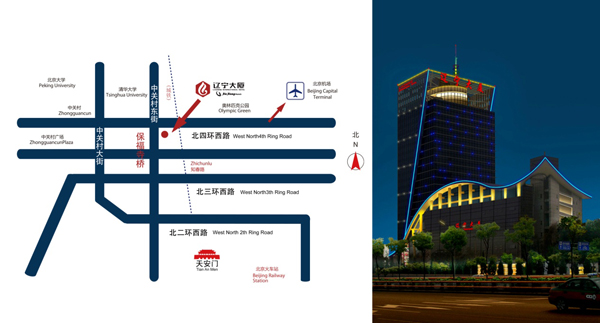 北京遼寧大廈位于北四環(huán)黃金地段,乘坐首都機場巴士即可到達。距譽有"中國硅谷"之稱的中關(guān)村信步可至,毗鄰北大清華,距中外聞名的奧運場館"鳥巢"僅5分鐘車程。地理位置得天獨厚,交通便捷。