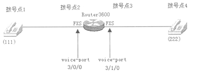 (1)在裝有兩個語音模塊的3600路由器上實現(xiàn)IP語音電話(如下圖所示)。