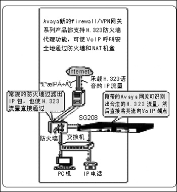 通常情況下,使用網(wǎng)絡(luò)地址解析(NAT)技術(shù),H.323流量都不能順利地通過防火墻或路由器設(shè)備。NAT利用掩碼將用戶的IP地址隱藏到了路由器中,用戶不得不向公共防火墻開放端口,以允許VoIP流量(如IP電話呼叫、微軟的網(wǎng)絡(luò)會議等)進入到企業(yè)內(nèi)部。而Avaya宣稱,這種新的H.323應用代理能識別通過NAT設(shè)備的IP和H.323地址,自動打開和關(guān)閉防火墻端口(不需要管理),使IP呼叫流量能安全地通過,不會給網(wǎng)絡(luò)留下漏洞。