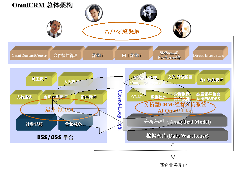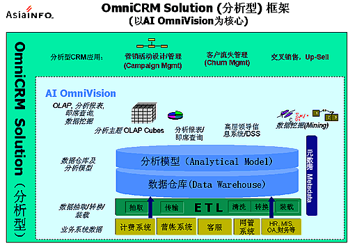 OmniCRM方案是亞信基于多年服務(wù)電信市場(chǎng)的豐富的行業(yè)經(jīng)驗(yàn),以及對(duì)國(guó)內(nèi)運(yùn)營(yíng)商業(yè)務(wù)發(fā)展的深刻認(rèn)識(shí)而推出的,其中,AI OmniVision是OmniCRM方案中經(jīng)營(yíng)分析型CRM 的核心產(chǎn)品。AI OmniVision不僅符合行業(yè)業(yè)務(wù)規(guī)范,而且基于對(duì)客戶行為、競(jìng)爭(zhēng)環(huán)境,商業(yè)獲利率以及其他參數(shù)的透徹分析,能夠使運(yùn)營(yíng)商充分了解現(xiàn)有客戶、識(shí)別并關(guān)注贏利的客戶組、提高服務(wù)質(zhì)量、確?蛻魸M意度和忠誠度;同時(shí)吸引潛在的客戶;加強(qiáng)提供新服務(wù)的投資回報(bào)率;提高效率、減小成本,以實(shí)現(xiàn)業(yè)務(wù)價(jià)值的最大化。AI OmniVision采用數(shù)據(jù)倉庫、ETL、OLAP分析、靈活報(bào)表展現(xiàn)及數(shù)據(jù)挖掘等技術(shù),包含了用戶分析、業(yè)務(wù)分析、收益分析、大客戶分析、營(yíng)銷分析、競(jìng)爭(zhēng)分析、服務(wù)質(zhì)量、新業(yè)務(wù)分析等眾多功能模塊。