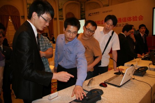 CTI論壇(ctiforum)4月25日消息(記者 潘婷婷): 廣東佳和通信技術(shù)有限公司主辦的首場(chǎng)企業(yè)智能通信體驗(yàn)會(huì),于2011年4月13日在廣州富力麗思卡爾頓酒店隆重召開,并取得圓滿成功。此次體驗(yàn)會(huì)來自佳和通信的負(fù)責(zé)人和業(yè)內(nèi)專家就佳和企業(yè)智能通信平臺(tái)的應(yīng)用以及協(xié)同辦公的發(fā)展趨勢(shì)發(fā)表了主題演講,為所有到場(chǎng)的100多位來賓做了詳實(shí)的介紹。同時(shí)展示了佳和“!毕盗械7個(gè)應(yīng)用解決方案,并對(duì)拳頭產(chǎn)品——智能IP話機(jī)T600、移動(dòng)分機(jī)M600、個(gè)人助理軟件IPA PRO等進(jìn)行了現(xiàn)場(chǎng)演示和互動(dòng),其目的在于使現(xiàn)場(chǎng)嘉賓充分感受企業(yè)智能通信的價(jià)值和魅力,同時(shí)親身體驗(yàn)到如何在在加速辦公自動(dòng)化的同時(shí)提高企業(yè)效率、節(jié)約成本。