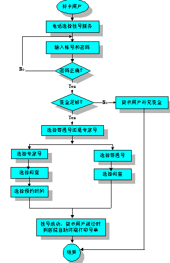 用戶(hù)連續(xù)三次輸入錯(cuò)誤,則服務(wù)終止。用戶(hù)輸入帳號(hào)密碼正確,則系統(tǒng)查詢(xún)用戶(hù)帳號(hào)上的資金,資金足夠,則系統(tǒng)繼續(xù)提示:"普通門(mén)診按1,專(zhuān)家門(mén)診按2"。