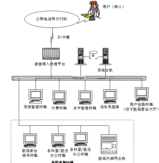 為了配合呼叫中心的運(yùn)作,給用戶(hù)(病人)就診提供方便,醫(yī)院需要為用戶(hù)設(shè)計(jì)和提供一個(gè)就診卡,該卡實(shí)際就是用戶(hù)的身份識(shí)別和資料存儲(chǔ)的ID卡。用戶(hù)第一次就診掛號(hào)時(shí),首先要到醫(yī)院登記,同時(shí)醫(yī)院為每個(gè)用戶(hù)分配一個(gè)ID號(hào)。以后,用戶(hù)就可以通過(guò)電話(huà)完成掛號(hào)或者進(jìn)行專(zhuān)家咨詢(xún),也可以雜醫(yī)院的自助終端上完成掛號(hào),通過(guò)電話(huà)輸入ID號(hào)就可以識(shí)別用戶(hù)身份。