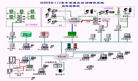 系統(tǒng)在設(shè)計時采用集中受理、分布測量的結(jié)構(gòu)化、模塊化設(shè)計:受理中心進(jìn)行112的集中受理和業(yè)務(wù)處理,端局完成相應(yīng)用戶線的測試功能,所有測試數(shù)據(jù)等均送至受理中心。系統(tǒng)測試準(zhǔn)確、任務(wù)分擔(dān)、負(fù)荷均衡,處理速度快,性能可靠。系統(tǒng)的受理模塊和測試模塊相互協(xié)調(diào)又各自獨立,使二者可以統(tǒng)一地作為SUNTEKTM-112集中受理及自動測試系統(tǒng),又能各自作為子系統(tǒng)與其它廠家(112系統(tǒng)、97系統(tǒng)、1000號等)的產(chǎn)品結(jié)合起來為112系統(tǒng)服務(wù)。系統(tǒng)網(wǎng)絡(luò)結(jié)構(gòu)圖如下所示: