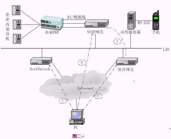 用戶使用系統(tǒng)時(shí),需要先下載終端并安裝到PC上,然后在終端上撥企業(yè)內(nèi)部的分機(jī)號(hào)碼就可以了。對(duì)于一般的企業(yè),VoIP語音網(wǎng)關(guān)可以配置幾條模擬線到一個(gè)E1的規(guī)模,SoftSwitch、語音網(wǎng)關(guān)、應(yīng)用服務(wù)器可以安裝在一臺(tái)PC或PC服務(wù)器上,或者與企業(yè)的其它服務(wù)器(如代理服務(wù)器)合用,另外需要一到兩個(gè)公網(wǎng)IP地址資源。系統(tǒng)的硬件和網(wǎng)絡(luò)成本非常低,整個(gè)系統(tǒng)如果按一個(gè)E1(30路)容量計(jì)算,配置VoIP網(wǎng)關(guān)和一臺(tái)PC服務(wù)器,硬件價(jià)格不超過3萬元,如果VoIP網(wǎng)關(guān)支持隧道模式傳送信令和語音,則語音網(wǎng)關(guān)也可以省去。