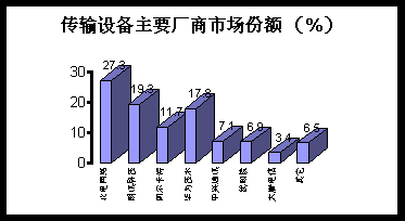。1) 市場規(guī)模: 年內(nèi),寬帶網(wǎng)絡(luò)熱的興起極大地推動(dòng)了傳輸設(shè)備市場的發(fā)展,以DWDM為代表的高端光傳輸設(shè)備已進(jìn)入大規(guī)模商用階段,包括光分插復(fù)用設(shè)備(OADM)和光交叉連接設(shè)備(OXC)與現(xiàn)有傳統(tǒng)的SDH等傳輸設(shè)備市場空前繁榮,全年出貨值達(dá)到104.8億元人民幣。