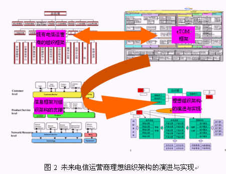 現(xiàn)有的電信運營商的管理架構(gòu)向理想的管理組織架構(gòu)演進過程中,要涉及到不同的中間過程和步驟,對中間過渡狀態(tài)的評估和有效實現(xiàn),是實現(xiàn)演進的關(guān)鍵,F(xiàn)有組織架構(gòu)管理職能的對應(yīng),業(yè)務(wù)流程的標準化,管理流程的標準化,企業(yè)IT支撐架構(gòu)對業(yè)務(wù)職能部門的支撐,這些環(huán)節(jié)都是運營商應(yīng)該重點考慮的中間內(nèi)容。圖2顯示了未來電信運營商理想組織架構(gòu)的演進與實現(xiàn)過程。其中的任何一個環(huán)節(jié)都是電信運營管理研究的核心課題,也直接影響到了電信運營管理變革的成敗。