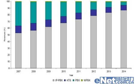 隨著中國經(jīng)濟的高速發(fā)展,企業(yè)通信市場也將保持一定的發(fā)展速度。Frost & Sullivan數(shù)據(jù)顯示,從2007年到2014年,國內(nèi)企業(yè)通信市場年均復合增長率為5.9%,到2014年市場規(guī)模約為4.82億美元。其中,企業(yè)IP通信市場將保持高速發(fā)展態(tài)勢,年均復合增長率將達到13.7%,市場規(guī)模將從2007年的1.71億美元增長到2014年的4.19億美元。屆時,IP通信將擁有整個企業(yè)通信市場86.9%的市場份額。傳統(tǒng)的PBX及KTS市場將持續(xù)萎縮。