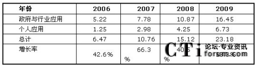 如圖1所示,F(xiàn)rost & Sullivan認(rèn)為,由于個(gè)人應(yīng)用領(lǐng)域的商業(yè)模式還未成熟,產(chǎn)業(yè)鏈整合仍在進(jìn)行中,目前移動(dòng)位置服務(wù)應(yīng)用仍然以政府和企業(yè)應(yīng)用為主。如圖4所示,2009年個(gè)人應(yīng)用市場規(guī)模為6.73億元,而政府與行業(yè)應(yīng)用市場達(dá)到16.45億元,兩者總計(jì)達(dá)23.18億元,同比去年增長了53.3%。