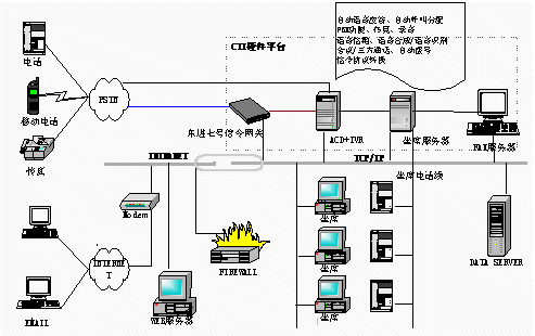 電信1000號(hào)客戶服務(wù)中心,集成了計(jì)算機(jī)網(wǎng)絡(luò)技術(shù)和計(jì)算機(jī)語(yǔ)音集成技術(shù)(CTI)。系統(tǒng)結(jié)構(gòu)可分為三部分:CTI硬件平臺(tái)、LAN網(wǎng)絡(luò)平臺(tái)、客戶服務(wù)軟件系統(tǒng)。東進(jìn)公司推出了基于板卡的CTI硬件方案,以七號(hào)信令網(wǎng)關(guān)進(jìn)行協(xié)議轉(zhuǎn)換。此硬件平臺(tái)具有以下優(yōu)點(diǎn):