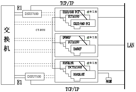 5.此平臺(tái)卡間采用CT-BUS協(xié)議(H.100 標(biāo)準(zhǔn))連接,機(jī)間配合東進(jìn)過(guò)機(jī)卡DCTx 160互連,兩臺(tái)七號(hào)信令網(wǎng)關(guān)DSIU7100 構(gòu)成雙機(jī)雙鏈路結(jié)構(gòu)。