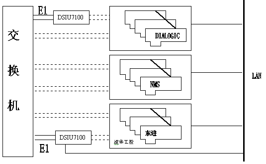 電信企業(yè)已有的112、114、170、189、180等系統(tǒng),這些系統(tǒng)的硬件設(shè)備各成體系,很可能由不同廠家的板卡組成:DIALOGIC、東進(jìn)、NMS,或其他品牌;還可能采用不同的信令方式:NO.1 信令、NO.7信令、 ISDN信令。如何把五花八門的系統(tǒng)集成起來(lái),以有效利用、降低成本?東進(jìn)七號(hào)網(wǎng)關(guān)DSIU7100提供解決此問(wèn)題的最好解決方案,系統(tǒng)可兼容不同廠家生產(chǎn)的不同數(shù)字中繼接口的語(yǔ)音板卡,最大限度的利用原有資源,結(jié)構(gòu)如下圖所示: