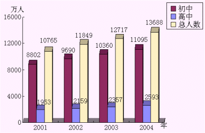 2001年,中國(guó)大陸中學(xué)學(xué)生人數(shù)已達(dá)10765萬(wàn)人,而且學(xué)生人數(shù)還在快速增長(zhǎng)。初中學(xué)生人數(shù)以每年6.5%的速度增長(zhǎng),普通高中學(xué)生人數(shù)也以每年10%-11%的速度增長(zhǎng)?梢钥闯,教育市場(chǎng)巨大的潛力和商機(jī)。