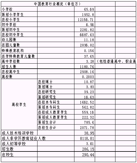 按照教育部2002年發(fā)布的《2002年全國(guó)教育事業(yè)發(fā)展統(tǒng)計(jì)公報(bào)》,教育部將整個(gè)社會(huì)的教育各個(gè)環(huán)節(jié)分為以下幾個(gè)部分:
