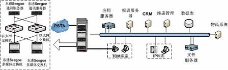 系統(tǒng)整體采用集中式架構(gòu),呼叫中心平臺采用東進(jìn)公司基于Yessoe技術(shù)開發(fā)的Seegoe多媒體交換機(jī)和Seegoe通信服務(wù)器。呼叫中心平臺與物流公司內(nèi)部的物流管理系統(tǒng)(如LM、SCM)通過TCP/IP進(jìn)行結(jié)合。呼叫中心系統(tǒng)具有豐富的媒體資源和強大的處理能力,并提供功能模塊的N+1全冗余備份,滿足了高負(fù)荷、大并發(fā)和關(guān)鍵業(yè)務(wù)的可靠運營。其次,Seegoe呼叫中心平臺在媒體交換層以全新的IP架構(gòu)實現(xiàn)網(wǎng)絡(luò)融合、應(yīng)用融合和業(yè)務(wù)融合,能夠很好的滿足電視購物行業(yè)對呼叫中心的要求。