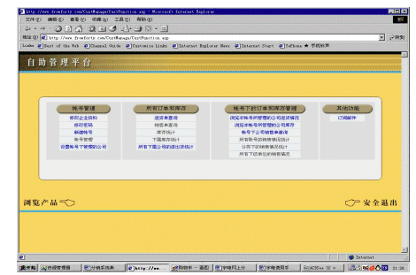 ebanswers分銷系統(tǒng)的一個(gè)重要特色就是自助管理平臺(tái),用戶可以在這個(gè)平臺(tái)中完成絕大部分管理、查詢和統(tǒng)計(jì)的工作。自助管理平臺(tái)主要有四大部分組成:帳號管理、公司下訂單和庫存管理、帳號下訂單和庫存管理、其他功能。其中帳號管理主要是管理與公司和帳號有關(guān)的各類信息,公司下訂單和庫存管理、帳號下訂單和庫存管理這兩個(gè)部分主要是用來查詢和統(tǒng)計(jì)各項(xiàng)信息的。