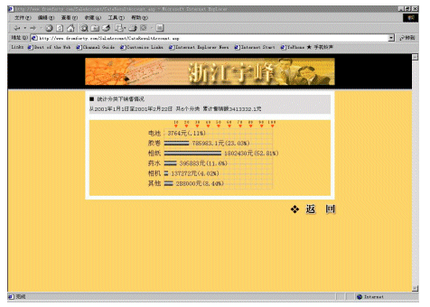 宇峰公司(www.fromforty.com)是柯達(dá)(中國)有限公司在中國華東地區(qū)的總代理,負(fù)責(zé)管理華東地區(qū)近600個(gè)分銷商和連鎖店。公司非常重視信息化建設(shè),添設(shè)了大量的計(jì)算機(jī),建立起初步的管理系統(tǒng)。但是直到2000年還是依靠E-mail傳遞大量的Excel表格獲取需要的產(chǎn)品銷售和庫存的信息。這些表格對各級分銷商查詢和統(tǒng)計(jì)數(shù)據(jù)來說非常麻煩,因?yàn)槊恐芤幚韼装賯(gè)訂購單。整個(gè)處理過程非常緩慢,并且成本很高,也容易造成各種的數(shù)據(jù)錯(cuò)誤。而公司內(nèi)部對業(yè)務(wù)人員銷售情況的統(tǒng)計(jì),也頗為麻煩,因?yàn)橄录壏咒N商上報(bào)上來的數(shù)據(jù)準(zhǔn)確性差,并且不夠及時(shí)。處理這些表格對宇峰公司和分銷商以及連鎖店而言都是效率很低的,并且常常令人茫然不知所措。