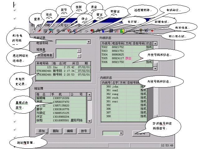 電話控制臺(tái)(軟電話),所有系統(tǒng)操作包括電話、查詢(xún)、短消息等等都可以通過(guò)鍵盤(pán)、鼠標(biāo)操作完成: