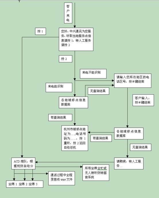 在中興通訊呼叫中心流程設(shè)計(jì)上充分體現(xiàn)了CTI技術(shù)以及數(shù)據(jù)庫(kù)技術(shù)等IT技術(shù)與星際先進(jìn)的管理理念的融合。該流程的設(shè)計(jì)保證將主動(dòng)提高服務(wù)品質(zhì)的工作集中于對(duì)呼叫者最重要的環(huán)節(jié)――對(duì)維修網(wǎng)點(diǎn)信息的咨詢(xún)上。它為所有呼叫者提供了詳細(xì)、精煉、基本的高品質(zhì)電話服務(wù),同時(shí)又根據(jù)電話區(qū)號(hào)提供了有針對(duì)性的咨詢(xún)服務(wù)。