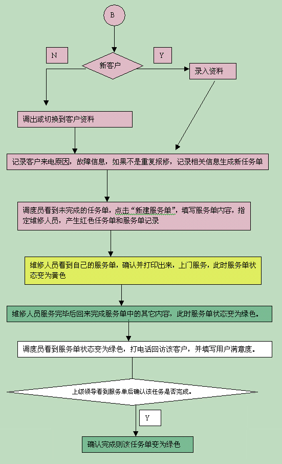 如果是需要上門維修的客戶,點擊"新建任務單",填寫任務單上的相關內容,此時任務單狀態(tài)為紅色;調度員看到新任務單,點擊"新建服務單",填寫服務單內容,指定維修人員。此時任務單狀態(tài)變?yōu)榧t色,服務單狀態(tài)則為紅色。維修人員看到自己的服務單,確認并打印出來,上門服務,此時服務單狀態(tài)變?yōu)辄S色;維修人員服務完畢后回來完成服務單中的其它內容,此時服務單狀態(tài)變?yōu)樗{色;調度員看到服務單狀態(tài)變?yōu)樗{色,打電話回訪該客戶,并填寫用戶滿意度;上級領導看到服務單后確認該任務是否完成。確認完成則該任務單變?yōu)樗{色,否則再派出一張服務單。直到任務完成。