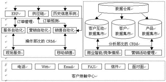正如圖1所示,現(xiàn)在一般認(rèn)為,目前的CRM產(chǎn)品分為這樣基本的三類:分析型CRM(圖中的分析層次的CRM)、運(yùn)營型CRM(圖中的操作層次的CRM)和交互型CRM(圖中的客戶接觸中心)。交互型CRM主要在于建立一個(gè)企業(yè)與用戶的交互、溝通渠道,如電話、傳真、Web、Email、短消息、面對(duì)面接觸;運(yùn)營型CRM主要在于運(yùn)行企業(yè)的市場營銷、銷售和服務(wù)的自動(dòng)化應(yīng)用,記錄客戶的基本信息和互動(dòng)信息;而分析型CRM則在于分析完整客戶信息(包括靜態(tài)的客戶基本信息和動(dòng)態(tài)的客戶交互信息),掌握和預(yù)測(cè)客戶的個(gè)性化需求,并開展相應(yīng)的營銷和銷售活動(dòng),提供相應(yīng)的服務(wù)和支持。