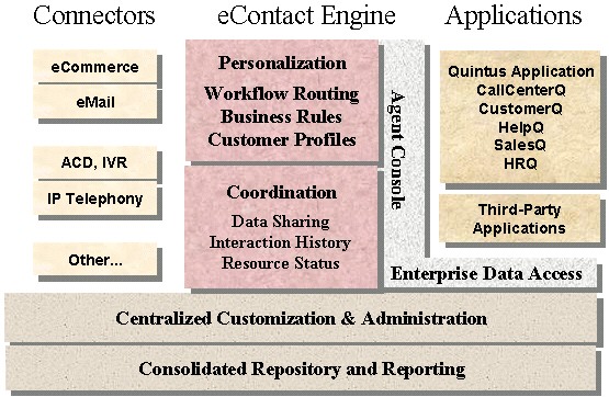 在CRM的實(shí)施中,有很多決定實(shí)施成敗的關(guān)鍵因素,其中之一就是CRM解決方案。目前,市場上的CRM產(chǎn)品林林總總,如國外的Siebel、SAP、Oracle、Clarify、Vantive,國內(nèi)創(chuàng)智的PowerCRM、用友的NC/CRM、聯(lián)成互動(dòng)的MyCRM、中圣的SellWell、TurboCRM等,各有自身的特色和優(yōu)勢(shì)。本文將從CRM理念的角度介紹另一款CRM解決方案——Quintus eContact Suit(簡稱QeS)解決方案,以供用戶甄選。