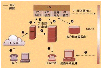 CTI (Computer Telephony Integration 計算機電信集成) 技術(shù)將計算機網(wǎng)和電話網(wǎng)連接在一起,把語音和數(shù)據(jù)服務(wù)集成為一體,使得構(gòu)造數(shù)據(jù)和語音的融合應(yīng)用得以實現(xiàn)。例如,由于CTI技術(shù)的引入,當用戶來話時,呼叫中心能根據(jù)用戶的呼叫信息如ANI(主叫號)結(jié)合數(shù)據(jù)庫迅速地識別用戶,實現(xiàn)“彈屏”功能;當電話轉(zhuǎn)接時,實現(xiàn)語音數(shù)據(jù)的同步轉(zhuǎn)移;根據(jù)所獲得的客戶信息及其他相關(guān)信息將來話路由到最適合服務(wù)的座席等。CTI技術(shù)包含了數(shù)據(jù)通信與語音通信兩大部分的內(nèi)容,關(guān)注的不僅僅是將基于計算機的智能技術(shù)運用到電話的發(fā)送、接收及管理,還要考慮各種媒體類型的信息傳送,包括實時信號和非實時信號,如傳真、電子郵件和視頻信號等。