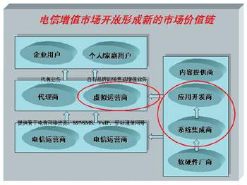 在電信增值市場開放的背景之下,新的市場價(jià)值鏈正在形成(如圖所示)。國內(nèi)電信建設(shè)轟轟烈烈的大規(guī)模基礎(chǔ)設(shè)施投資已是明日黃花,改善應(yīng)用“稀缺”的現(xiàn)狀才是當(dāng)務(wù)之急。李峻認(rèn)為,信息產(chǎn)品技術(shù)服務(wù)提供商最主要的任務(wù),就是幫助運(yùn)營商開發(fā)針對(duì)中國市場的增值業(yè)務(wù),并帶動(dòng)其主業(yè)協(xié)同發(fā)展。即面向電信網(wǎng)絡(luò)運(yùn)營商以及虛擬運(yùn)營商,提供增值業(yè)務(wù)系統(tǒng)整體解決方案及其軟硬件支撐平臺(tái)和應(yīng)用系統(tǒng)。