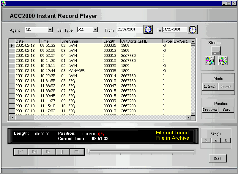 DVD RAM媒體具有存儲容量大(高達9.4GB,可以保存連續(xù)900小時以上/每通道的語音數(shù)據(jù))、保存壽命長(30年)、可靠性強、檢索速度快的特點。ACC2000 DVD Record Backup采用高效的語音壓縮技術,可以將語音信息壓縮后直接存儲在DVD RAM光盤上。
