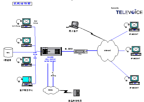 ACC2000通過(guò)H.323協(xié)議連接Internet,遠(yuǎn)程人員在任何位置(使用配備聲卡和耳麥的PC)只要登錄Internet即可實(shí)現(xiàn)遠(yuǎn)程座席功能.