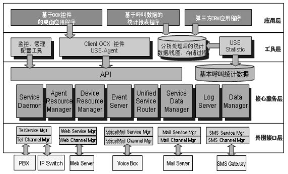 青牛USE從體系結構上分為四個層次。第一層為外圍接口層,負責接入、抽象和發(fā)布來自不同渠道的服務請求;第二層是核心服務層,它是青牛USE軟件的核心部分,對來自不同渠道的服務請求和服務回復進行統一的服務排隊管理、資源調度管理、日志數據管理等,屏蔽了不同渠道的物理特性,真正實現統一路由、統一管理;第三層是工具層,是青牛USE提供給應用開發(fā)商和集成商的開發(fā)接口和配置工具;第四層,USE產品的應用層,為呼叫中心應提供應用功能,比如:呼叫統計分析、呼叫監(jiān)控等。