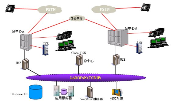 如圖所示,分布式應用模式下,各分支節(jié)點的USE負責本地的呼叫控制和分配,Global USE負責呼叫在不同分支點之間的互專和數據控制。