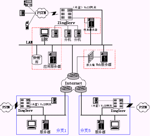 目前清華誠志數(shù)碼公司分支機構有5個,可以通過ZingServ交換機的內(nèi)置VoIP功能在5個分支機構實現(xiàn)組網(wǎng),從而大大節(jié)省長話費用,并實現(xiàn)內(nèi)部分機號統(tǒng)一編碼:
