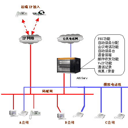 | 多個(gè)小型辦公室共享一個(gè)電話系統(tǒng)或局域網(wǎng)是一個(gè)比較經(jīng)濟(jì)選擇,現(xiàn)在很多辦公樓也是采用這種方式為大樓里的辦公室提供通訊或數(shù)據(jù)服務(wù),大大減少了租戶的通訊的投資。但是采用傳統(tǒng)的交換機(jī)也帶來(lái)很多不便。如只能有一個(gè)總機(jī),撥入的電話不知道是找哪個(gè)公司的,既增加接線員的工作,又不利樹(shù)立公司的形象。如何公平地向共用交換機(jī)的辦公室的收取電話費(fèi)也是個(gè)解決不了的問(wèn)題,因?yàn)闊o(wú)法記錄和統(tǒng)計(jì)每個(gè)辦公室的撥出的電話量。 但是采用奧迪堅(jiān)的ALTISERV,這些問(wèn)題很自然地就解決了。將每個(gè)辦公室設(shè)成一個(gè)工作組,每個(gè)工作組可以設(shè)置特定的撥入撥出電話市話號(hào)碼,對(duì)總機(jī)而言,來(lái)電時(shí)的桌面顯示公司名,或者通過(guò)多個(gè)自動(dòng)話務(wù)臺(tái)直接轉(zhuǎn)入工作組。 對(duì)于撥出電話,只能通過(guò)事先設(shè)定電話進(jìn)入市話網(wǎng)。這樣,這個(gè)電話的全部費(fèi)用都由這個(gè)公司。 此外,共享的辦公室及其員工都可以使用ALTISERV提供的全部功能,就好象這個(gè)辦公室建了一個(gè)專門(mén)的網(wǎng)絡(luò)電話系統(tǒng)一樣。 接線圖如下: |