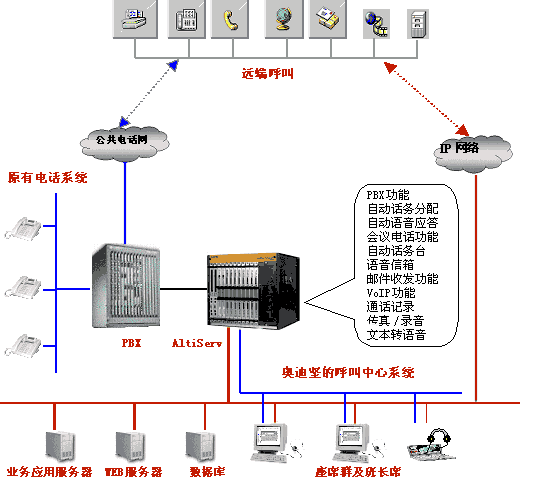 您的企業(yè)內(nèi)部已有一套大型的交換機(jī)系統(tǒng),但非常希望在銷售、技術(shù)支持等與客戶接觸頻繁的部門,建立自己的客戶服務(wù)中心系統(tǒng),此時(shí)您只需要將奧迪堅(jiān)高度整合的呼叫中心平臺(tái)掛接在您的交換機(jī)后端即可。
