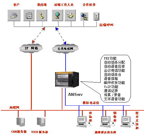 奧迪堅(jiān)呼叫中心平臺在一臺服務(wù)器(AltiServ)上整合了所有常用呼叫中心的功能,并提供與CRM軟件的接口平臺,從而真正提升客戶滿意度,提高企業(yè)本身的盈利能力。