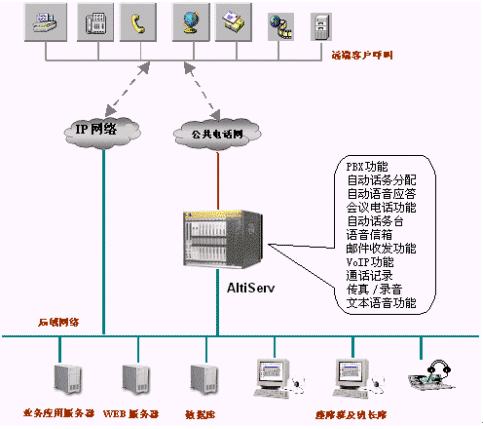 該系統(tǒng)包括 ALTISERVE®、IVR、 自動(dòng)傳真、 智能選擇坐席ACD、 來電號(hào)碼的顯示、監(jiān)督系統(tǒng)、客戶資料的查詢與錄入、查詢統(tǒng)計(jì)、現(xiàn)有資源的集成、開放的