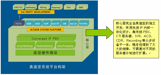 值得一提的是,在穩(wěn)定性上,奧迪堅(jiān)IP一體化呼叫中心平臺系統(tǒng)構(gòu)架,從產(chǎn)品設(shè)計(jì)之初就突破了以住基于交換機(jī)或板卡的傳統(tǒng)模式,在一臺通訊服務(wù)器上高度融合了呼叫中心的所有常用功能,有效避免了復(fù)雜的網(wǎng)絡(luò)連接和眾多的各類交換機(jī)和外掛設(shè)備,各個(gè)設(shè)備相對獨(dú)立兼容性差所給呼叫中心系統(tǒng)所帶的穩(wěn)定性欠佳的隱患。除此之外,奧迪堅(jiān)呼叫中心系統(tǒng)底層硬件模塊是在美國設(shè)計(jì)生產(chǎn)的,通過北美和中國的嚴(yán)格的電信入網(wǎng)測試;相對于硬件,平臺軟件也都是由奧迪堅(jiān)自主開發(fā)設(shè)計(jì)的,針對不同的硬件采用不同的驅(qū)動(dòng)模塊,軟硬一體在交換層又使用統(tǒng)一的邏輯接口,結(jié)構(gòu)清晰,層次合理,不僅保障了穩(wěn)定而且便于擴(kuò)展(如下圖所示),整個(gè)系統(tǒng)作為一個(gè)整體統(tǒng)一擴(kuò)展,不需要對不同的服務(wù)器分別進(jìn)行擴(kuò)展,有效避免了傳統(tǒng)呼叫中心構(gòu)建方式在擴(kuò)展方面存在的復(fù)雜性問題以及高額的擴(kuò)展費(fèi)用。