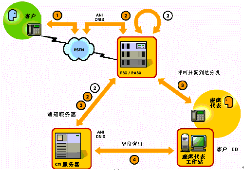 ②呼叫到達(dá)業(yè)務(wù)交換機(jī)并通知服務(wù)器(ANI –自動號碼識別)