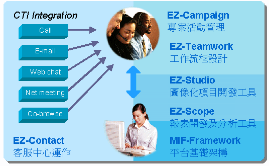 EZactor客服中心CRM平臺(tái)系統(tǒng),以MIF-Framework模塊為平臺(tái)基礎(chǔ)架構(gòu),在該強(qiáng)大之穩(wěn)定架構(gòu)上以EZ-Contact模塊作為客服中心運(yùn)作核心,另外延伸有EZ-Campaign、EZ-Teamwork、EZ-Scope、EZ-Studio等模塊,分別提供營(yíng)銷活動(dòng)管理、工作流程設(shè)計(jì)、數(shù)據(jù)統(tǒng)計(jì)與分析、項(xiàng)目開發(fā)工具等功能,全面滿足客服中心運(yùn)行之需要。