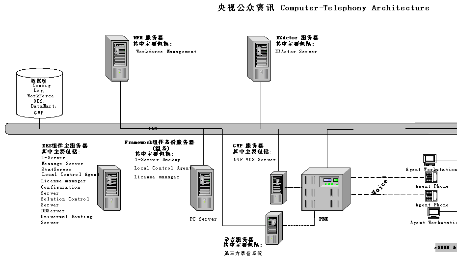 針對(duì)CCTV公眾資訊中心系統(tǒng)平臺(tái)更新改造的要求,eSOON公司提供的解決方案包括EZactor CRM產(chǎn)品 & Genesys CTI/GVP產(chǎn)品。