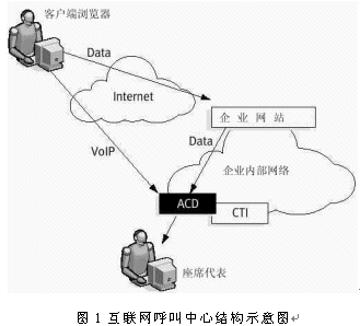 互聯(lián)網(wǎng)呼叫中心是在互聯(lián)網(wǎng)技術(shù)飛速發(fā)展的基礎上所產(chǎn)生的。對于客戶而言,完全的互聯(lián)網(wǎng)呼叫中心和傳統(tǒng)呼叫中心最大的區(qū)別就在于客戶無需電話,只要從一個Web站點就可以直接進入互聯(lián)網(wǎng)呼叫中心。這樣一來,呼叫中心就從傳統(tǒng)形式上的“撥號-交談(Dial to Talk)”發(fā)展到現(xiàn)代形式的“點擊-交談(Click to Talk)”。典型的互聯(lián)網(wǎng)呼叫中心結(jié)構(gòu)如圖1所示。
