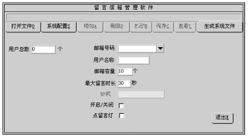 1). 您可修改的參數(shù)有:用戶名稱、用戶密碼、信箱容量、最大留時長、開啟/關(guān)閉、點留言燈。有關(guān)參數(shù)的細(xì)節(jié)將在增加信箱一節(jié)中介紹。