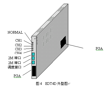 EDT4D是在舊EDT4板上增加調(diào)度接口。見圖4,EDT4D為一塊H20-20交換機插板,厚度為兩個槽口。EDT4通過扁平電纜與交換機公共控制機柜的背板PGA相連,提取交換機時隙;并將時隙轉(zhuǎn)換為由四個數(shù)字中繼接口E1組成的準V5.2接口與遠端模塊相連。一塊EDT4可接2個PGA端口組,共128個話路。