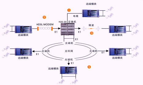 遠端模塊通過標準2M(E1)接口與交換機連接。該接口不受傳輸距離和傳輸設備的限制。常用的傳輸設備有SDH、PDH光端機(光纜),數(shù)字微波、數(shù)字擴頻,HDSL調(diào)制解調(diào)器(雙絞線)等。