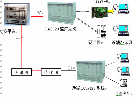 DAS120交換平臺采用1-4個E1連接,可以簡潔實現(xiàn)PCM信號轉模擬信號引出到座席。E1接口的信令可選配為隨路信令CAS和透明通道Clear Channel。E1可通過光端機、微波、HDSL等設備來傳輸,從而實現(xiàn)分布式組網(wǎng)。