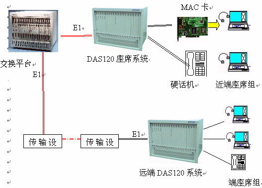 DAS120交換平臺(tái)采用1-4個(gè)E1連接,可以簡潔實(shí)現(xiàn)PCM信號(hào)轉(zhuǎn)模擬信號(hào)引出到座席。E1接口的信令可選配為隨路信令CAS和透明通道Clear Channel。E1可通過光端機(jī)、微波、HDSL等設(shè)備來傳輸,從而實(shí)現(xiàn)分布式組網(wǎng)。