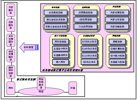 我們已經(jīng)看到,軟交換技術(shù)支持的電信業(yè)務(wù)能力一直在不斷發(fā)展,開發(fā)新的電信業(yè)務(wù)已經(jīng)成為電信運(yùn)營商市場競爭的重要條件。事實(shí)上,業(yè)務(wù)能力是電信運(yùn)營商或是電信用戶關(guān)心的基本問題,而不是實(shí)現(xiàn)這種業(yè)務(wù)的具體的技術(shù)和體系結(jié)構(gòu)。選擇何種技術(shù)和結(jié)構(gòu),則是電信運(yùn)營商依據(jù)自有的資源做出的選擇。因此,業(yè)務(wù)驅(qū)動的軟交換平臺需要根據(jù)實(shí)際的情況選取合適的技術(shù)和結(jié)構(gòu)實(shí)現(xiàn)所需的業(yè)務(wù)。我們把實(shí)現(xiàn)電信業(yè)務(wù)中涉及的要素稱為業(yè)務(wù)管理對象。軟交換平臺涉及到以下的六類業(yè)務(wù)管理對象:會話協(xié)議體系、接入/互連控制、業(yè)務(wù)控制、應(yīng)用控制、內(nèi)容控制和網(wǎng)絡(luò)控制。會話協(xié)議體系是任何電信業(yè)務(wù)的基礎(chǔ)。對接入、互聯(lián)、業(yè)務(wù)、應(yīng)用和內(nèi)容的控制也是建立電信業(yè)務(wù)所必需的。網(wǎng)絡(luò)控制涉及到一個(gè)新業(yè)務(wù)和網(wǎng)絡(luò)全局的關(guān)系。除了平臺管理業(yè)務(wù)之外,每個(gè)業(yè)務(wù)管理對象均包含一個(gè)可選擇/可設(shè)計(jì)的集合,供業(yè)務(wù)設(shè)計(jì)時(shí)使用。所有這些業(yè)務(wù)管理對象的集合,構(gòu)成了業(yè)務(wù)驅(qū)動軟交換平臺的控制功能的整體。下圖給除了業(yè)務(wù)驅(qū)動軟交換平臺上的業(yè)務(wù)管理對象,以及從這些業(yè)務(wù)管理對象映射的軟交換系統(tǒng)實(shí)例。